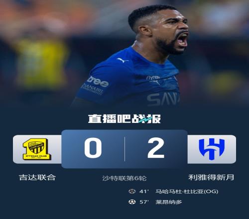 沙特联本轮焦点大战,吉达联合0-2不敌新月,莱昂纳多破门,杜比亚乌龙。