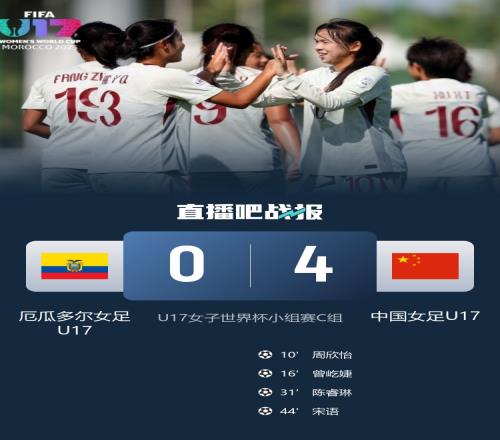 U17女子世界杯小组赛C组,中国对阵厄瓜多尔,周欣怡、曾屹婕、陈睿琳、宋语先后破门,中国队4-0取胜,小组第二晋级16强。