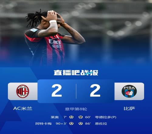米兰本轮2-2战平升班马比萨,莱奥、阿特卡梅远射破门,萨勒马科尔斯最后时刻遗憾错失绝杀。此役后,米兰先赛2分领跑。