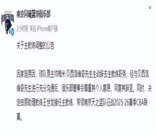 虽然新赛季还没有正式开打,不过已经有球队进行换帅了,这支球队就是同曦男篮。据同曦男篮发布官宣,贝西洛维奇因为家庭原因辞去球队主教练的职务,助教王世龙成为球队的新主帅。据篮球资讯透露,贝西洛维奇离队的原因是因为同曦男篮在俱乐部杯比赛中的表现不好,球队管理层和他沟通,希望他能够改变球队的现状。不过贝帅表示目前球队已经失控,部分球员根本就不听他的战术安排,贝帅要求裁掉不听话的球员,但被球队管理层拒绝。随后双方再次沟通,贝帅依旧无法解决问题,最终只能下课。